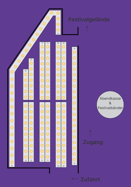Der Campingplatz befindet sich nur wenige Meter vom Festivalgelände entfernt und ist ausschließlich für Zelte und Pavillons geeignet. Fahrzeuge sind hier nicht gestattet.Ein Camping-Ticket gilt pro Person.